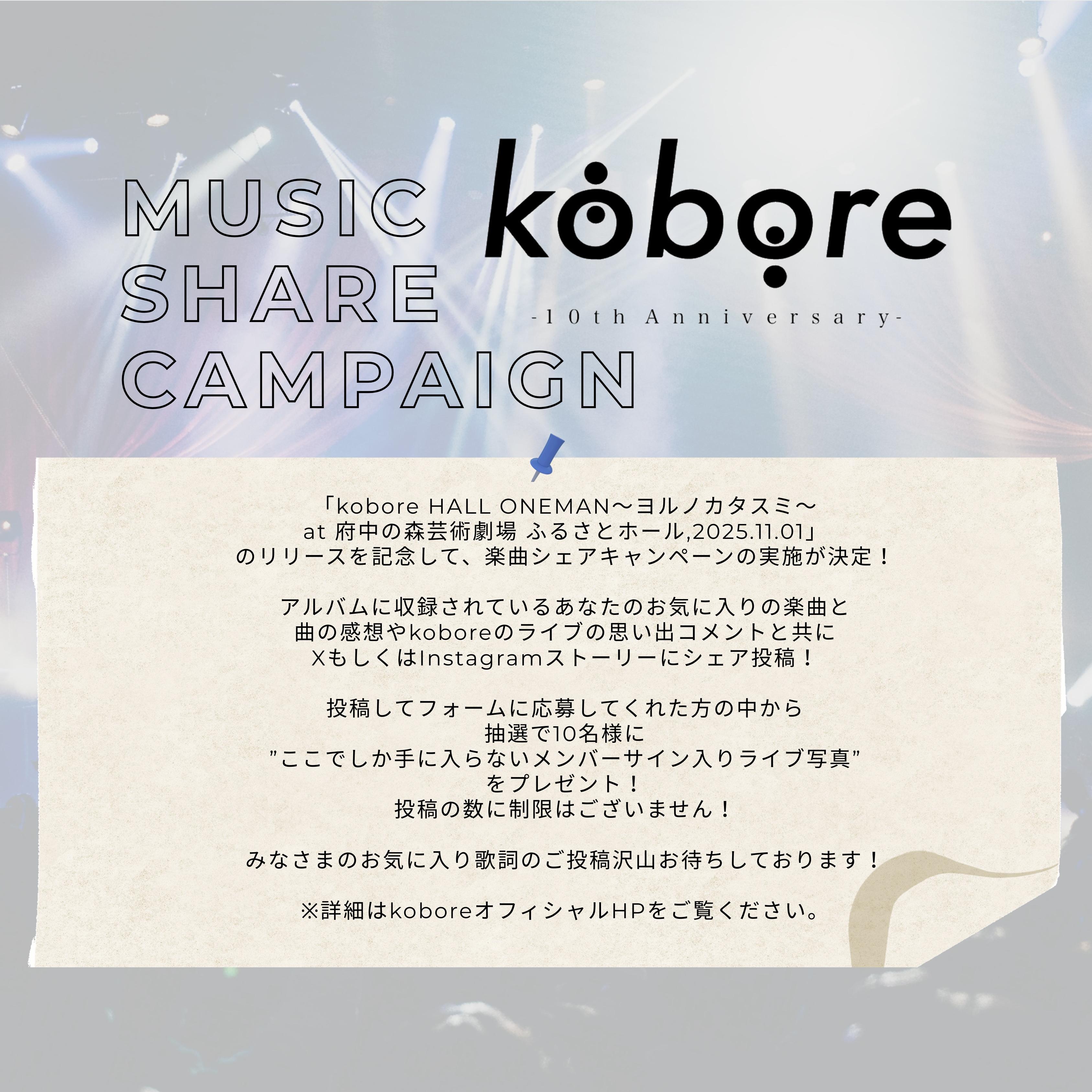 ライブアルバム「kobore HALL ONEMAN〜ヨルノカタスミ〜at 府中の森芸術劇場 ふるさとホール,2025.11.01」に収録されているあなたのお気に入りの楽曲と曲の感想やkoboreのライブの思い出コメントと共にXもしくはInstagramストーリーにシェア投稿してください!